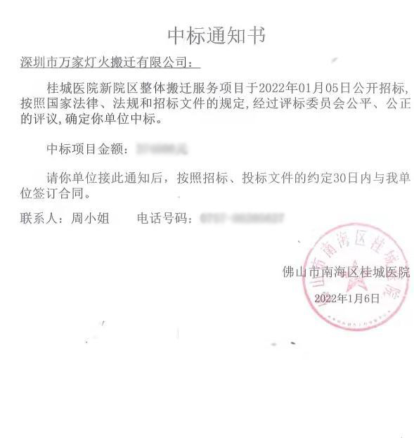 我公司在2022年1月就中标南海区桂城医院整体搬家项目 。