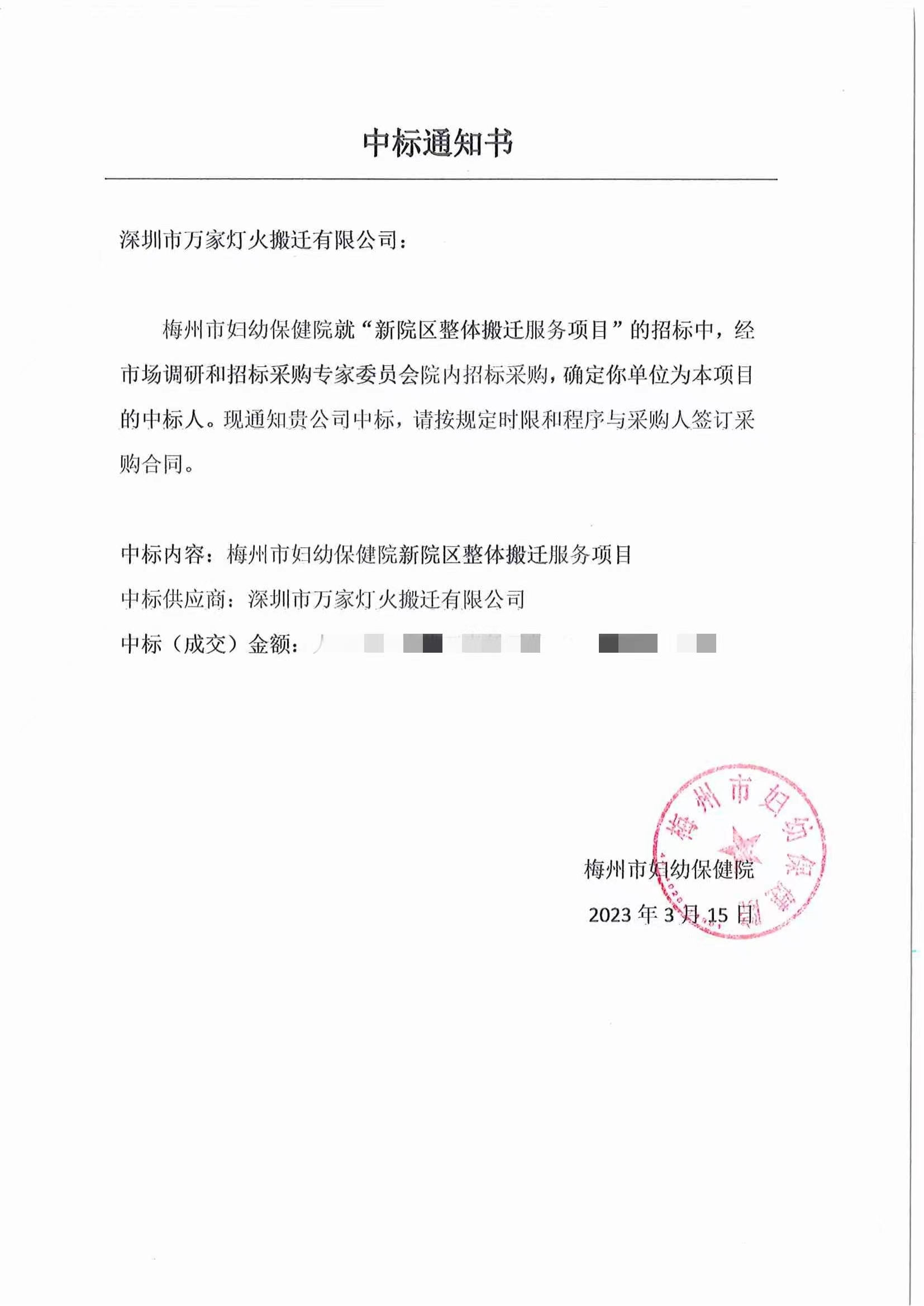由于现时代的现真相形旧院已无法知足现在的营业需求,以是需要对旧院的物资装备、住院病人整体搬家和转运到新院区,通过前期多方较量遴选,我公司以多年服务医疗单位,拥有多年医院搬家履历、手艺实力和车辆工具优势脱颖而出,乐成中标“梅州市妇幼保健院新院区整体搬家服务项目” 。